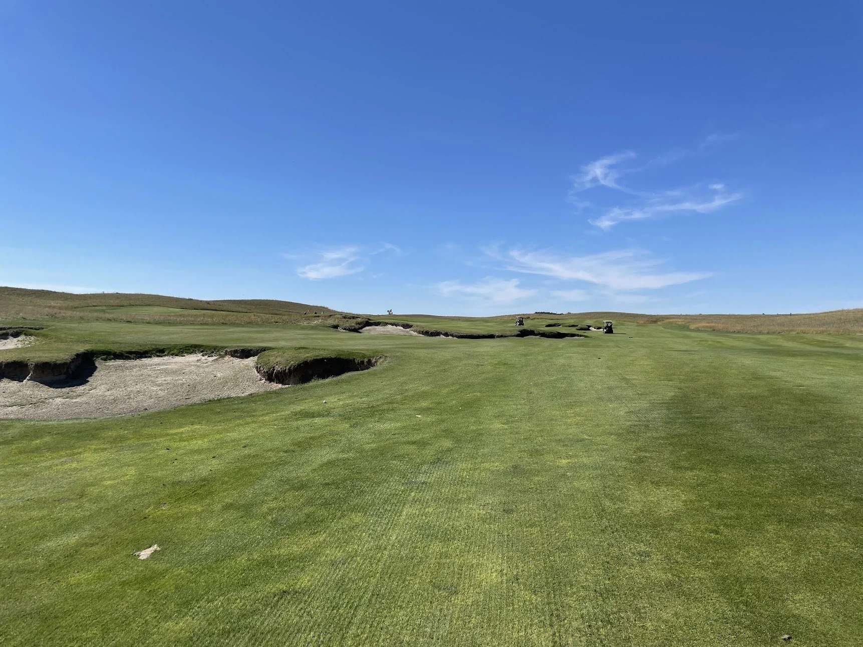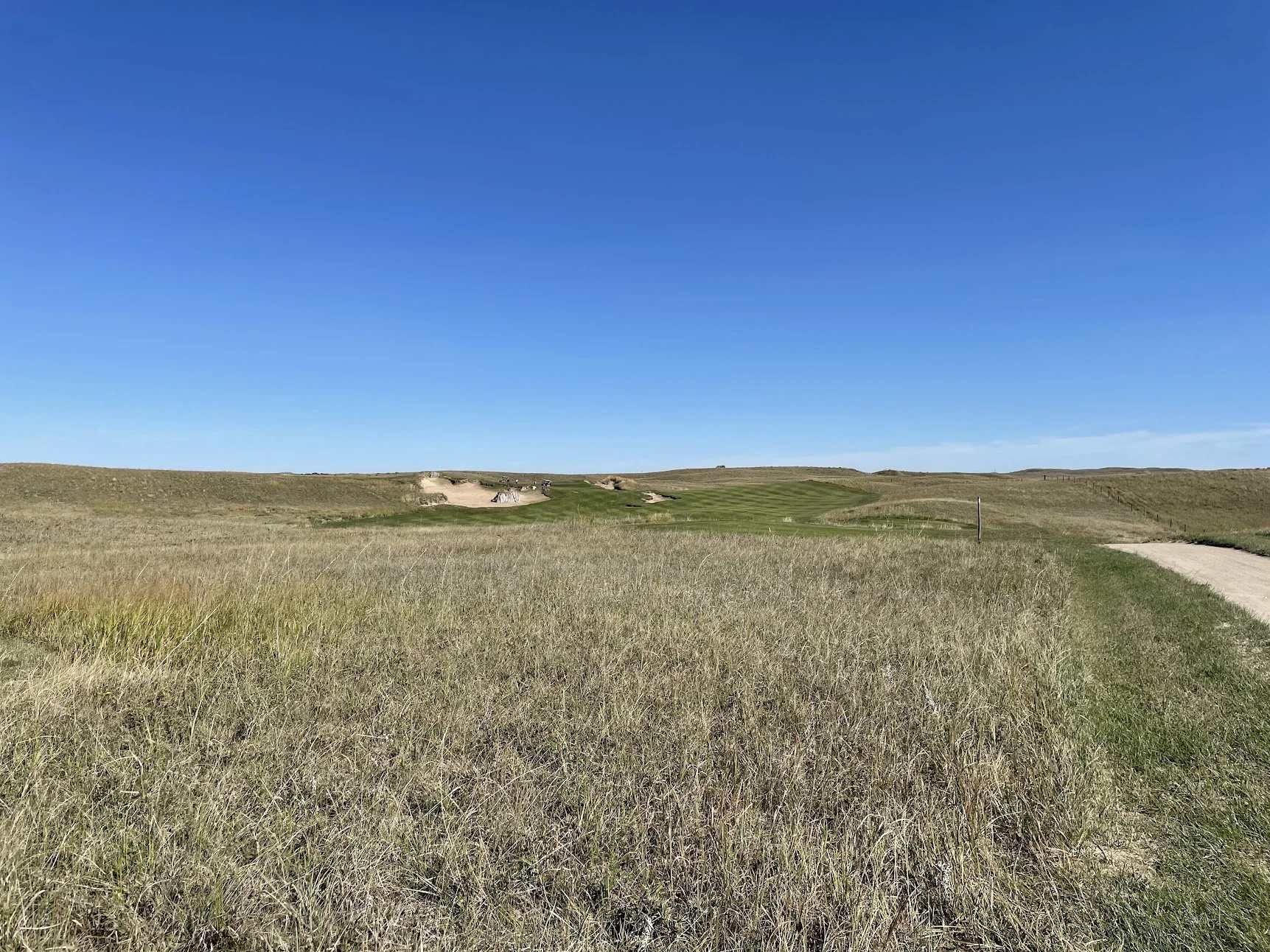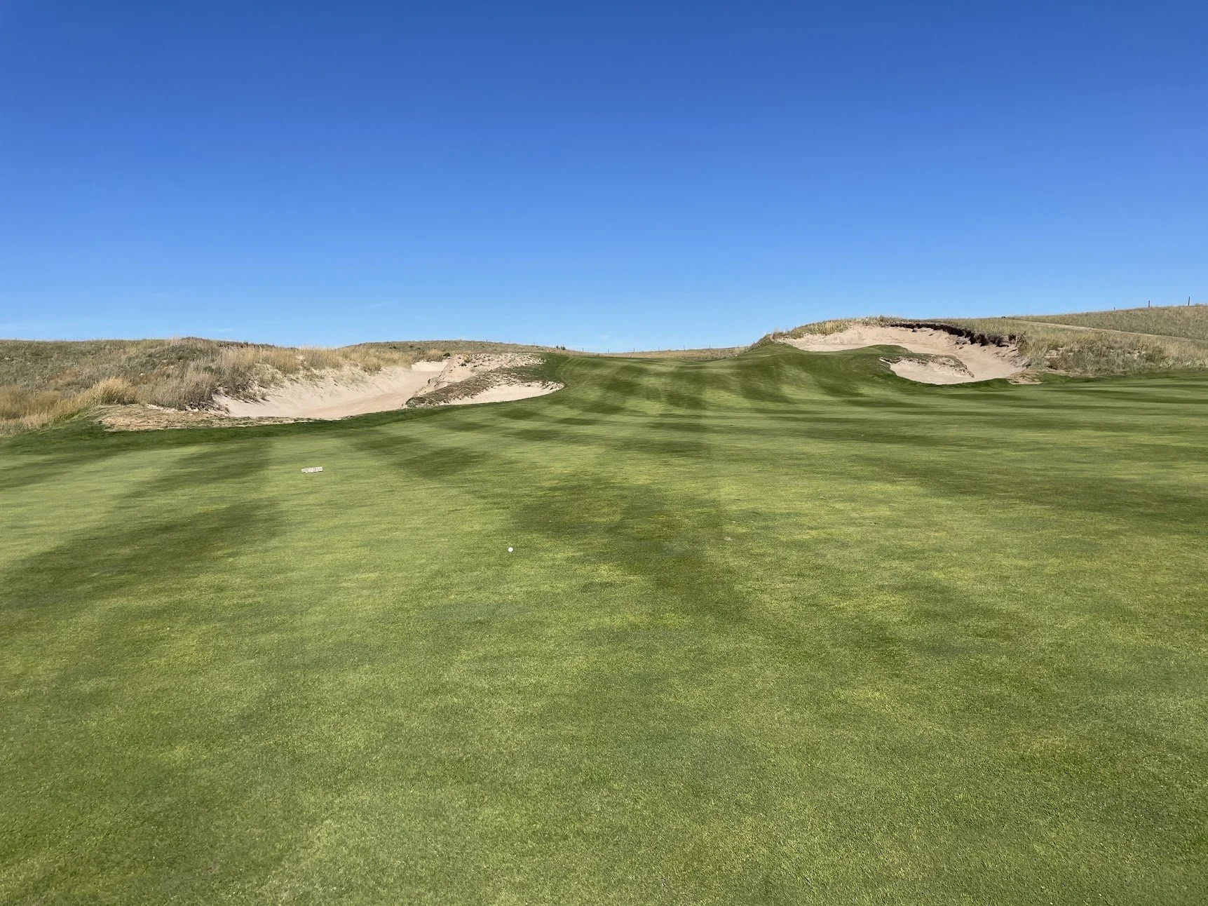 The eighth is a fairly straightforward par 4, by Prairie Club standards. Players will want to keep their drives between the bunkers off the tee.